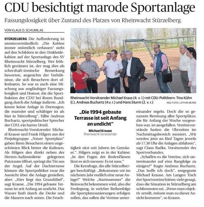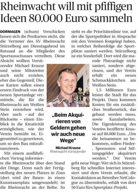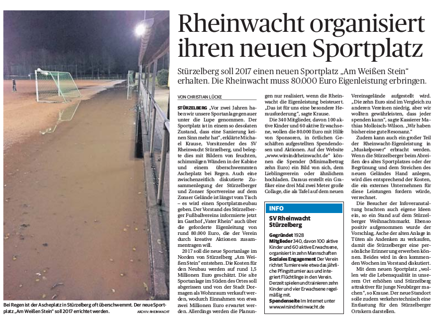 Wie die meisten sicherlich schon wissen entsteht am neuen Standort „Am Weißen Stein“ im nächsten Jahr die neue städtische Sportanlage für Stürzelberg. Im Gegenzug wird nach Fertigstellung die alte Sportanlage an der Schulstraße rückgebaut und danach als Bauland durch die Stadt Dormagen vermarktet. Für uns als SV Rheinwacht, aber auch für den gesamten Ort, bedeutet dieses eine sichere Zukunftsplanung, um unseren Kindern und Jugendlichen die Möglichkeit der Begegnung auf sportlicher, aber vor allem auch auf sozialer Ebene, zu geben. Aber auch für den gesamten Ort ist die Erhaltung der Infrastruktur natürlich sehr wichtig, um auch in der Zukunft als Stürzelberg attraktiv für neue Mitbürger zu sein und damit den Zuzug von vor allem jungen Familien zu fördern.