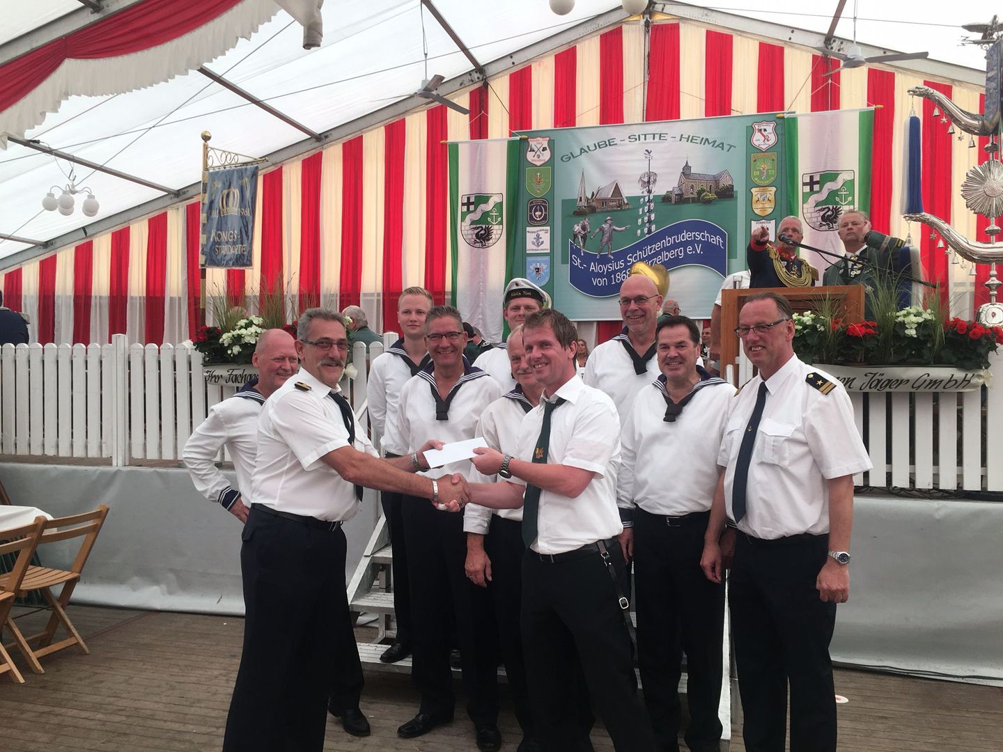 Anlässlich des Stürzelberger Schützenfestes Anfang August erhielten wir eine großzügige Spende in Höhe von 1.100 € vom Marine-Zug „Käpt'n Flint“. Der Zug hat sich in seiner letzten Versammlung vor dem Schützenfest dazu entschlossen die Rheinwacht hiermit bei dem Projekt zu unterstützen. Alle Mitglieder des Zuges waren in ihrer Jugend, teilweise auch noch im Seniorenbereich und im Vorstand bei der Rheinwacht aktiv und tragen das Rheinwacht-Gen noch immer in sich. Obwohl die meisten heute nicht mehr oder nur noch wenig mit der Rheinwacht „am Hut“ haben, beschlossen sie einstimmig diese stattliche Summe dem Verein spontan zukommen zu lassen, damit auch in Zukunft noch viele weitere Kinder und Jugendliche, teilweise auch schon Enkel der Matrosen und Offiziere, mit diesem „Gen infiziert“ werden.